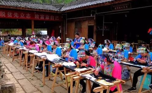酉陽自治縣車田鄉小寨村苗繡“扶貧車間”,當地婦女正在學習苗繡技藝。近年來,該縣苗繡企業在政府鼓勵扶持下,將“扶貧車間”設到貧困村里,為貧困群眾免費培訓技能,回收苗繡產品,讓她們在家門口務工。 通訊員 楊春來 攝