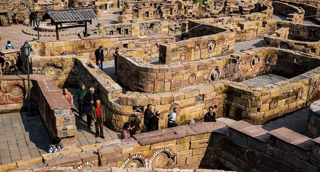 “石來運(yùn)轉(zhuǎn)”也稱四方井迷宮,走進(jìn)迷宮內(nèi),一座座景墻錯落有致地排列其中,景墻上面鑲嵌著石磨、石缸、石墩、石槽等諸多老物件,古樸的氣息在整個迷宮景觀中漫延。
