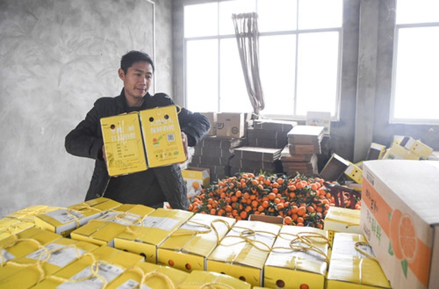 ↑2019年12月28日,42歲的村民畢明剛在自己開設的電商服務點準備將臍橙發貨。新華社記者王全超攝