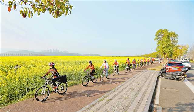 重慶廣陽島,一隊騎行愛好者迎著明媚的春光邊賞花邊鍛煉。特約攝影 鐘志兵