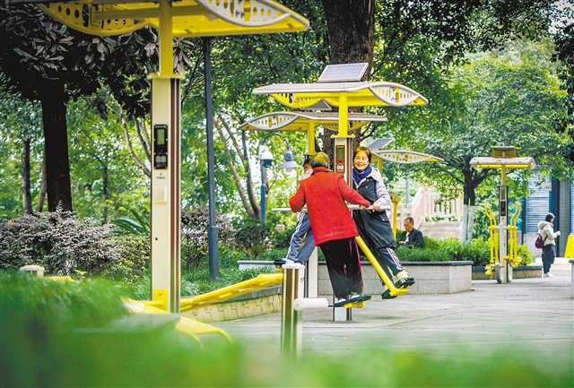 渝中區李子壩抗戰遺址公園,市民在智慧健身器材上鍛煉。記者 龍帆 攝