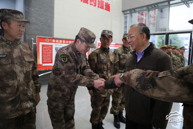 在縣人武部,官兵們精神飽滿、軍容整齊。張學鋒同官兵們親切握手,代表縣委、縣人大、縣政府、縣政協和全縣人民向駐云部隊全體官兵、民兵預備役人員致以新春的問候,向其家屬親人支持國防和軍隊建設表示衷心感謝。他說,近年來,云陽深學篤用習近平總書記視察重慶重要講話精神,全力打好“三大攻堅戰”,落實“八項行動計劃”,做好“五大重點”工作,經濟社會快速發展,人民群眾的獲得感、幸福感、安全感不斷提升,這背后離不開云陽駐云官兵的支持和保障。張學鋒希望大家要繼續發揚不怕疲勞、連續作戰的精神,堅守好崗位、履行好職責,繼續發揚敢打硬戰、敢于拼搏的精神,精誠團結、內強素質、外塑形象,做好人武部的各項工作,為云陽的社會和諧穩定、經濟發展做出新的貢獻。
