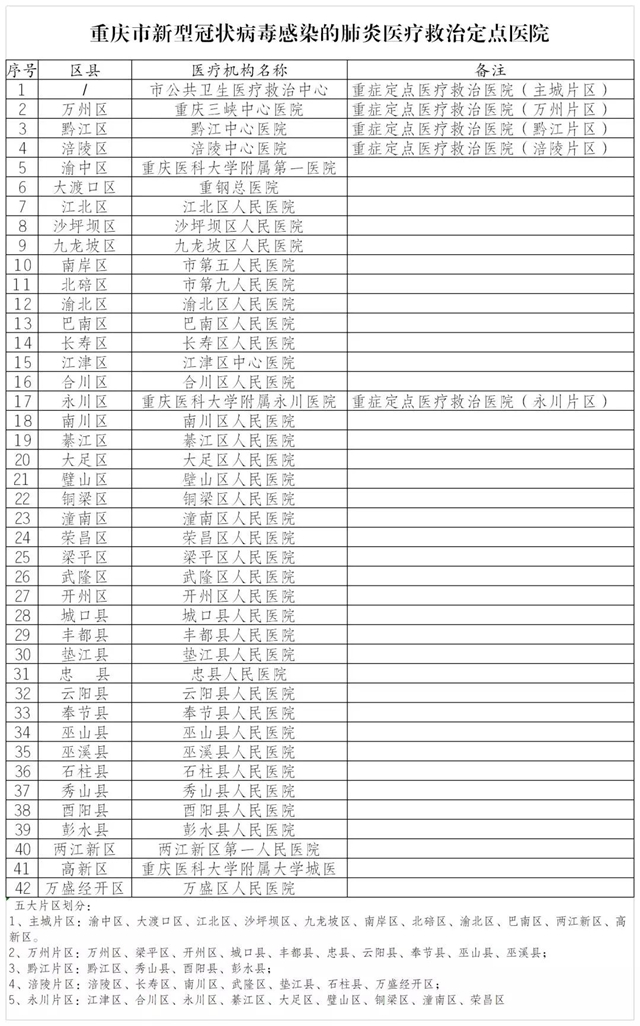 此前,重慶已公布42家新型冠狀病毒感染的肺炎醫療救治定點醫院。