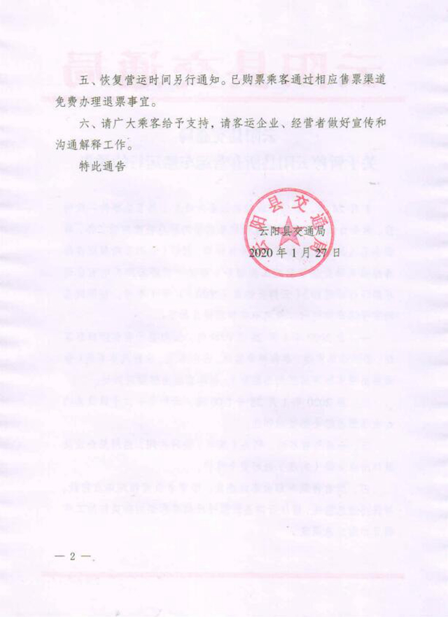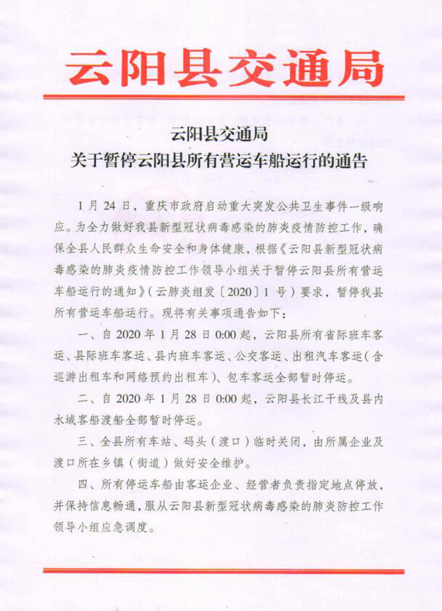 一、自2020年1月28日0:00起,云陽縣所有省際班車客運、縣際班車客運、縣內(nèi)班車客運、公交客運、出租汽車客運(含巡游出租車和網(wǎng)絡預約出租車)、包車客運全部暫時停運。