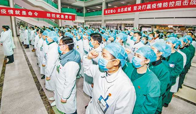 1月28日,重慶三峽中心醫院抗擊新型冠狀病毒感染的肺炎誓師大會舉行,200多名黨員醫務工作者誓言團結一致,沖鋒在前,堅決打贏疫情防控阻擊戰。特約攝影 冉孟軍