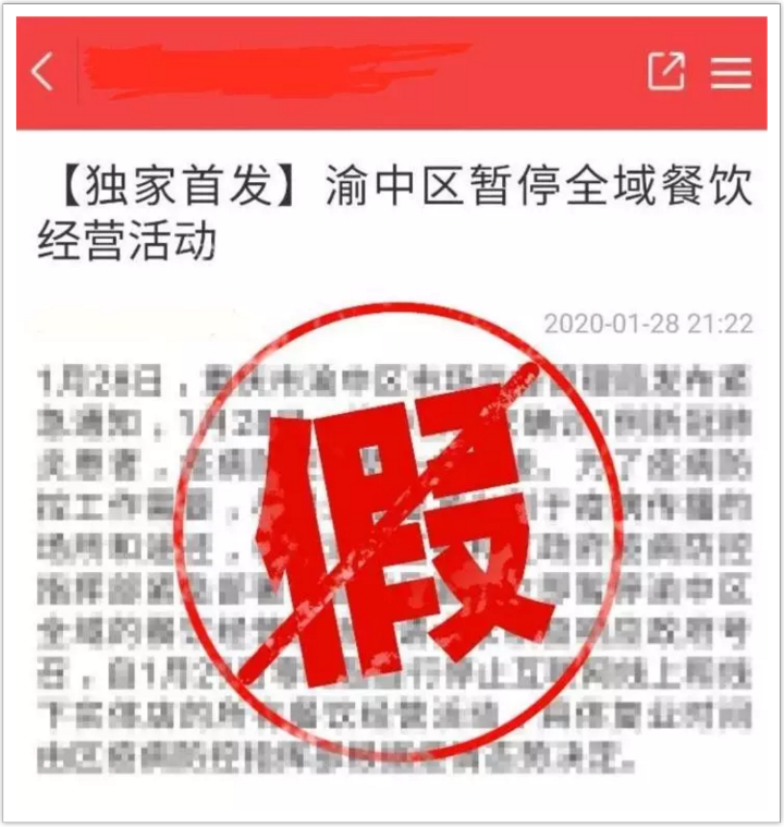 28日,某網站發布題為“【獨家首發】渝中區暫停全域餐飲經營活動”的消息。經證實,渝中區疫情防控指揮部從未發布稿件中提及的消息,從未要求暫停全域餐飲經營活動。當日晚上,該網站發布申明,對此次有誤報道“渝中區暫停全域餐飲經營活動”向公眾致歉!1月25日,渝中區商務委發出通告,要求取消大型宴會活動和大型人員聚集活動。同時,提醒小餐飲經營場所,做好顧客體溫檢測和經營消毒等工作,從未要求暫停區內所有餐飲經營活動。
