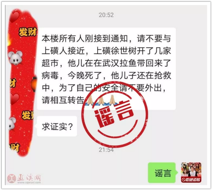 據巫溪有關部門通報,近日,有網民在網絡傳播“巫溪上磺徐某兒子武漢拉魚回來染病去世”的消息,經核實,巫溪上磺有位徐某是開著超市、在賣魚,不過全名與謠傳消息不符合。1月28日,有關部門證實:網傳消息反映情況不屬實,徐家人稱此消息純屬謠言,全家去年未去過武漢,家人并沒有生病。互聯網并不是法外之地,請廣大網民樹立法治意識,增強辨別能力。