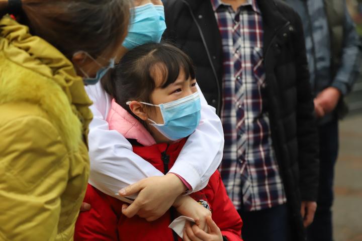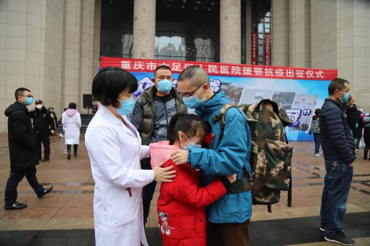 大足區人民醫院重癥醫學科況剛醫生,妻子也是同醫院產科醫生,況剛此前在華西醫院重癥醫學科進修,昨天下午接到醫院通知赴鄂援助,立刻趕回大足。昨晚抵家后,9歲女兒已熟睡,今天一大早就去醫院做準備動員工作,沒來得及和孩子告別。得知爸爸要去湖北,女兒含淚抱住爸爸不肯放手。 受訪醫院供圖 華龍網發