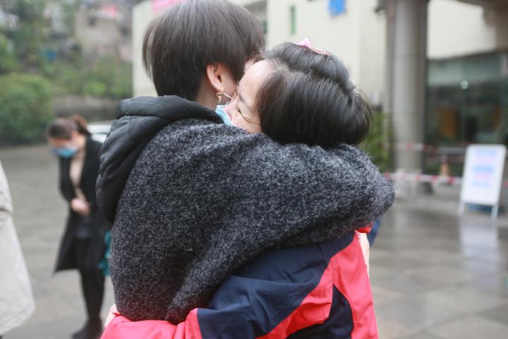 綦江區人民醫院前的廣場上,即將出征的兒科護士文道會與朋友相擁道別。受訪醫院供圖 華龍網發