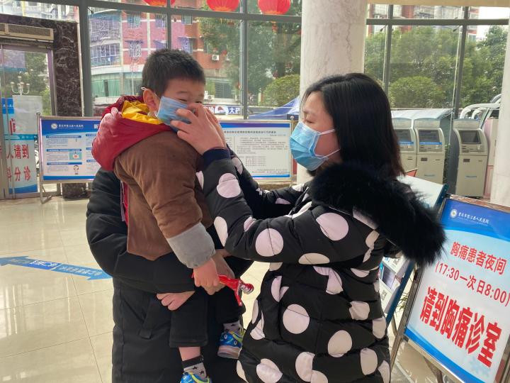 墊江縣人民醫院大廳里,即將出征的重癥醫學科江慢和她3歲孩子道別。 受訪醫院供圖 華龍網發