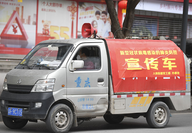 2月4日,通過車載廣播進行疫情防控宣傳的車輛經過重慶市云陽縣人和街道。 新華社記者王全超攝