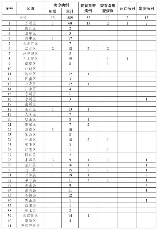 新增確診病例中,萬州區1例、渝中區1例、江北區2例、綦江區1例、潼南區3例、豐都縣3例、墊江縣1例、云陽縣1例;新增重型病例中,萬州區7例、忠縣1例、兩江新區1例;重型病例轉普通型病例中,綦江區1例、兩江新區1例;重型病例轉危重型病例中,武隆區1例、奉節縣1例;危重型病例轉重型病例為銅梁區1例;新增出院病例為萬州區1例。