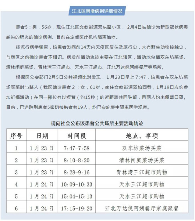 患者5:男,56歲,現(xiàn)住江北區(qū)文教街道雙東路小區(qū), 2月4日被確診為新型冠狀病毒感染的肺炎的確診病例。目前在定點醫(yī)療機構(gòu)隔離治療。