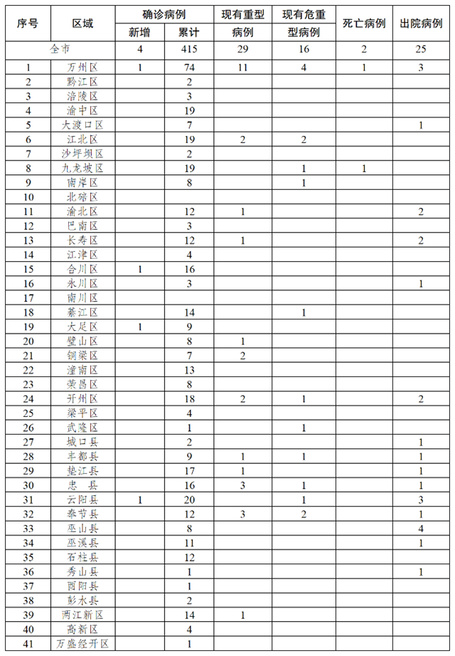 新增確診病例中,萬州區1例、合川區1例、大足區1例、云陽縣1例;新增出院病例為萬州區1例。