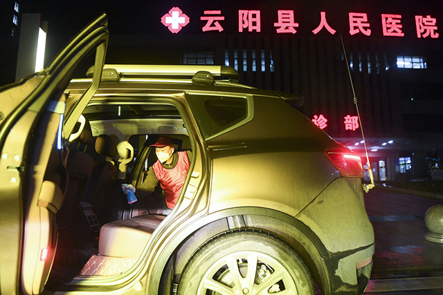↑2月6日晚,郭高平在云陽縣人民醫院等候下夜班的醫務人員時給車做清潔。新華社記者 王全超 攝