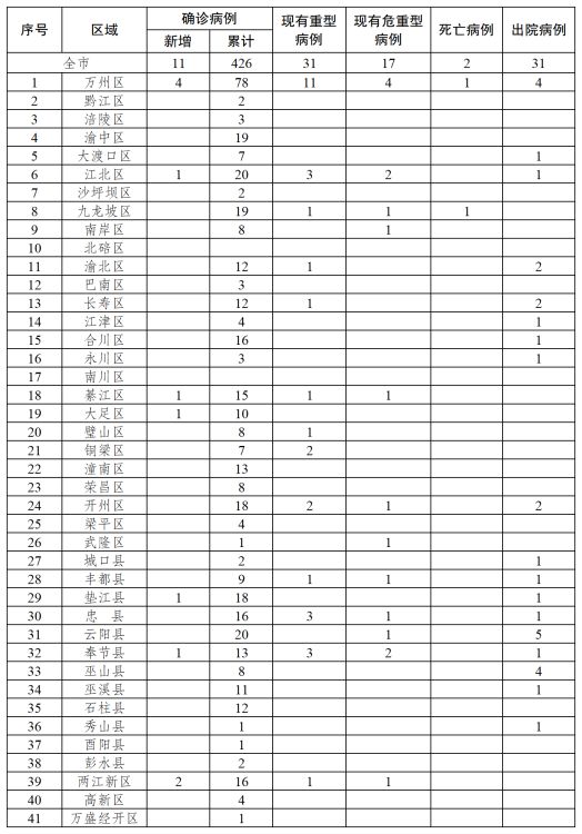 新增確診病例中,萬州區4例、江北區1例、綦江區1例、大足區1例、墊江縣1例、奉節縣1例、兩江新區2例;新增重型病例中,萬州區1例、江北區2例、九龍坡區1例、綦江區1例;重型病例轉普通型病例中,萬州區1例、江北區1例、墊江縣1例;新增危重型病例為兩江新區1例;新增出院病例中,萬州區1例、江北區1例、江津區1例、合川區1例、云陽縣2例。