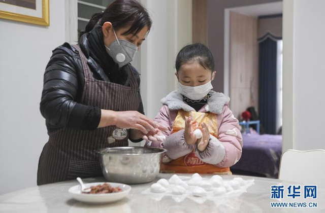 2月6日,重慶市云陽縣海峽小學一年級學生周彥希在家人的指導下學習包湯圓。(新華社記者 王全超/攝)