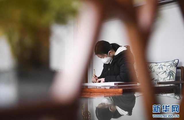 2月6日,重慶市云陽縣第三初級(jí)中學(xué)一年級(jí)學(xué)生吳雨?duì)N在家中練習(xí)書法。(新華社記者 王全超/攝)