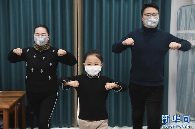2月6日,重慶市云陽(yáng)縣海峽小學(xué)一年級(jí)學(xué)生周彥希和爸爸媽媽一起在家中做廣播體操。(新華社記者 王全超/攝)