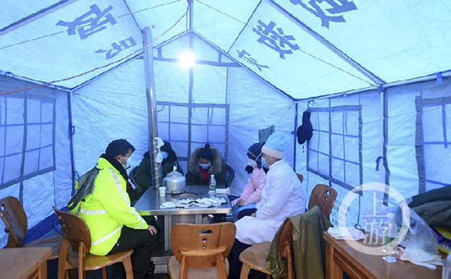 在寒冷的天氣下,執法人員與工作人員輪流到帳篷中休息片刻。