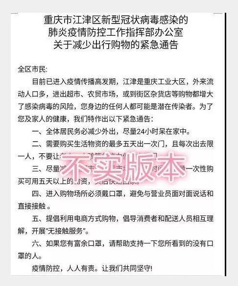 謠言3:《江津區(qū)新型冠狀病毒感染的肺炎疫情防控工作指揮部辦公室關于減少出行購物的緊急通告》文件公布