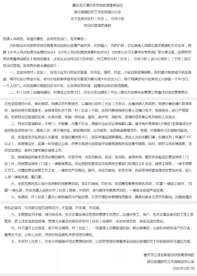 經(jīng)核查,此文件為不實版本,7日,江津區(qū)防控辦正式發(fā)布《江津區(qū)關于實施全區(qū)村(社區(qū))、住宅小區(qū)封閉式管理的通知》,決定從2020年2月7日0時起,全區(qū)所有村(社區(qū))、住宅小區(qū)實行封閉式管理,具體措施詳見如下: