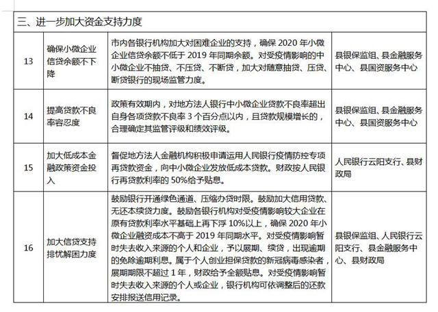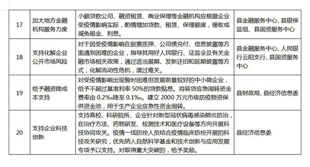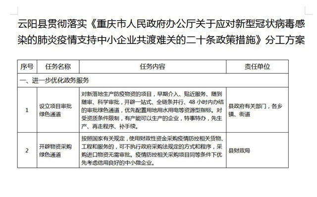 《云陽(yáng)縣貫徹落實(shí)〈重慶市人民政府辦公廳關(guān)于應(yīng)對(duì)新型冠狀病毒感染的肺炎疫情支持中小企業(yè)共渡難關(guān)的二十條政策措施〉分工方案》,已經(jīng)縣政府同意,現(xiàn)印發(fā)給你們。請(qǐng)各單位根據(jù)職能職責(zé),主動(dòng)對(duì)接市級(jí)部門(mén),認(rèn)真研究細(xì)化各項(xiàng)政策措施,切實(shí)抓好各項(xiàng)政策措施落地落實(shí)。