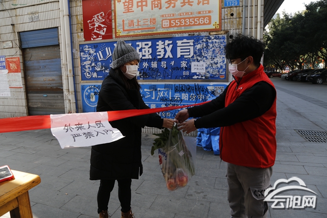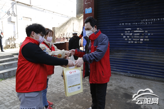 待工作人員將即將配送的商品挑選完后,超市負責人熊立新驅車來到青龍街道磨子嶺社區,第一時間將新鮮的食材送到居民饒幫明手中。