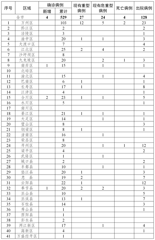 新增確診病例中,南岸區1例、合川區2例、奉節縣1例;新增死亡病例為萬州區1例;新增出院病例中,涪陵區1例、渝中區2例、大渡口區1例、渝北區1例、合川區1例、璧山區1例、銅梁區1例、開州區1例、墊江縣2例、奉節縣1例、兩江新區1例、高新區1例。