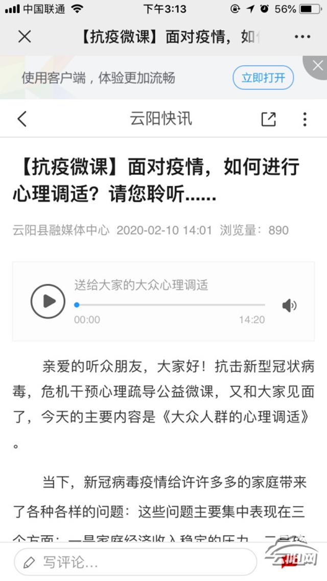 為加強心理疏導,2月3日,縣婦聯成立云陽縣危機干預心理咨詢工作組,面向全縣機關事業單位職工、醫護人員、社區工作者、廣大婦女及家庭提供危機干預服務,由3名著名的心理咨詢師任督導老師,廣泛招募13名專業心理咨詢師志愿者作為工作組成員,建立線上咨詢平臺,開設危機干預服務。自工作組成立以來,線上已接診案例5例。同時,縣婦聯還積極整合資源,與重慶市心理咨詢師協會云陽工作站積極籌備錄制《新型冠狀病毒感染下的肺炎疫情心理健康指導公益微課》,截止目前,已錄4期課程,閱覽量達37011人次。