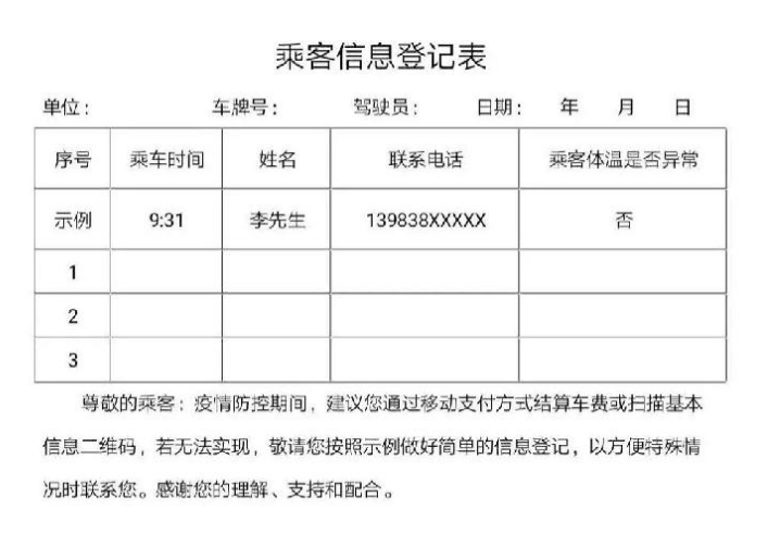 從2月17日起至主城區疫情防控結束,主城區出租車啟用實名登記乘車。主城出租車將統一在車內張貼乘客乘車二維碼,對通過非移動支付方式結算的乘客,乘車前實行掃碼登記,掃碼時只提取乘客手機號碼,不提取其它任何信息。對未攜帶手機或使用手機不便無法使用移動方式支付的乘客,由駕駛員引導乘客做好手工信息登記,登記信息主要為乘客手機號碼,登記表式樣見附表,由各出租車經營者發放給駕駛員,并在第二天安排專人收集、錄存。凡通過移動支付方式結算乘車費用的乘客,在支付費用時已自動提取手機信息,不用再掃乘車二維碼。搭乘網約車的乘客,在呼叫車輛時手機號碼已提取,因此網約車內不用張貼乘車二維碼。