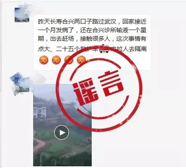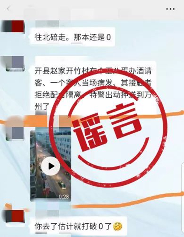 近日,網(wǎng)傳一則視頻信息,稱“開州區(qū)趙家街道開竹村村民辦酒席,酒席后出現(xiàn)大量新冠肺炎病例,當(dāng)?shù)貙iT出動特警押送至萬州”等。相關(guān)視頻在多個區(qū)縣的微信群持續(xù)傳播,且該謠言經(jīng)改頭換面,在多地網(wǎng)上流傳,引發(fā)不少網(wǎng)民恐慌。