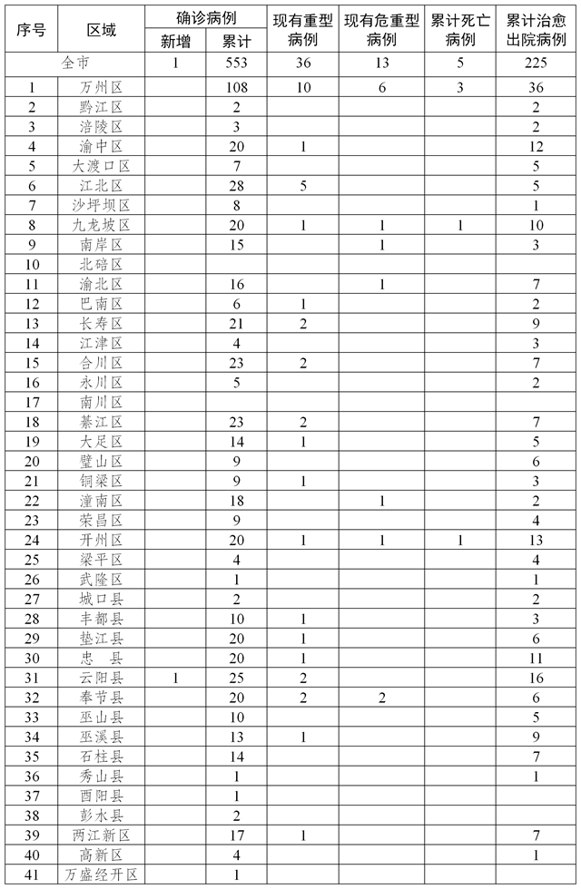 新增確診病例為云陽縣1例;新增治愈出院病例中,萬州區(qū)1例、涪陵區(qū)1例、江北區(qū)2例、九龍坡區(qū)2例、巴南區(qū)1例、江津區(qū)1例、合川區(qū)1例、綦江區(qū)1例、大足區(qū)2例、璧山區(qū)1例、榮昌區(qū)1例、忠縣1例。