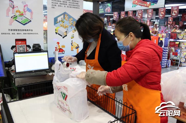 當天上午,記者來到萬家驛智慧生鮮超市,看到超市工作人員正戴著口罩、手套等,為線上下單的顧客配貨。打單、揀貨、裝袋……不一會兒,外送的物資就擺滿了整個貨架。超市員工告訴記者:“為保障食品安全,超市每天都會對公共區域進行兩次全面消毒,每日上班前和上班后各測一次體溫,上崗期間都必須佩戴口罩和手套。每日進貨的新鮮蔬菜都有專人檢測,檢測通過才能進入超市,市民下單的物資也是超市派專人專車免費配送到封閉管理卡點,再由物管人員轉交給群眾。”