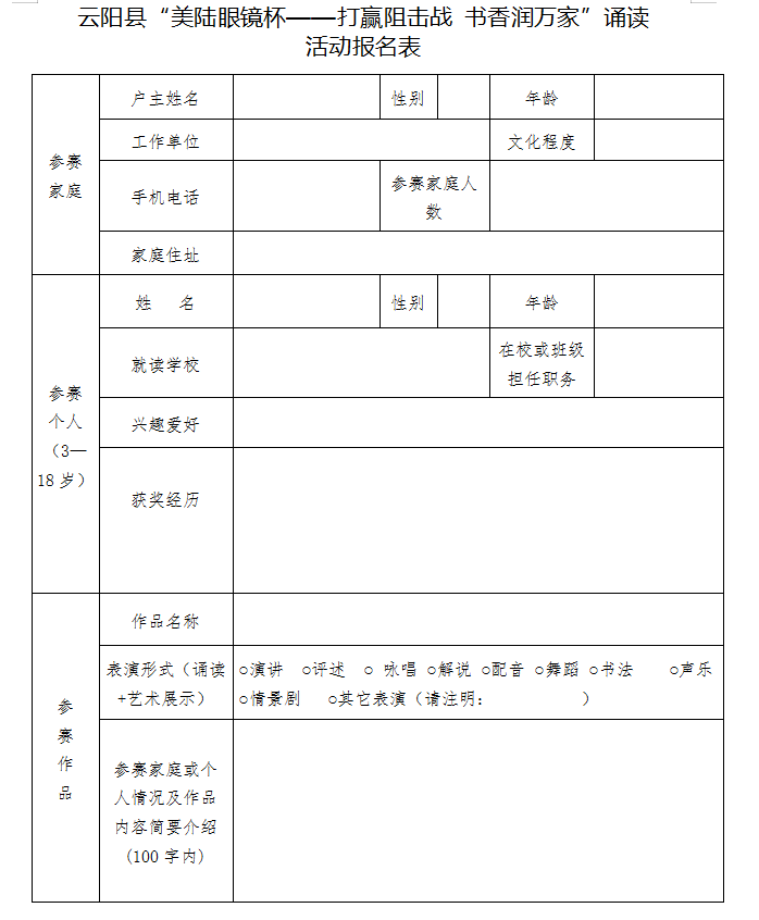 活動分為家庭參賽和個人參賽兩種形式。家庭參賽對象為云陽縣常住家庭,參與家庭至少推選2名家庭成員參加,且其中至少1名為18周歲以下的未成年人。個人參賽對象為云陽縣3至17歲青少年兒童,可單獨或組隊參賽。參賽人員需錄制參賽視頻,時長為1~3分鐘,分辨率480P以上,畫質(zhì)清晰,MP4格式,作品名稱為“姓名+誦讀作品名稱+聯(lián)系電話”,并附上電子版報名表和1 張參賽作者家庭生活照,發(fā)送至郵箱mengyuanma@zxllet.com進(jìn)行投稿,投稿聯(lián)系人:馬夢媛,電話:18323127261。