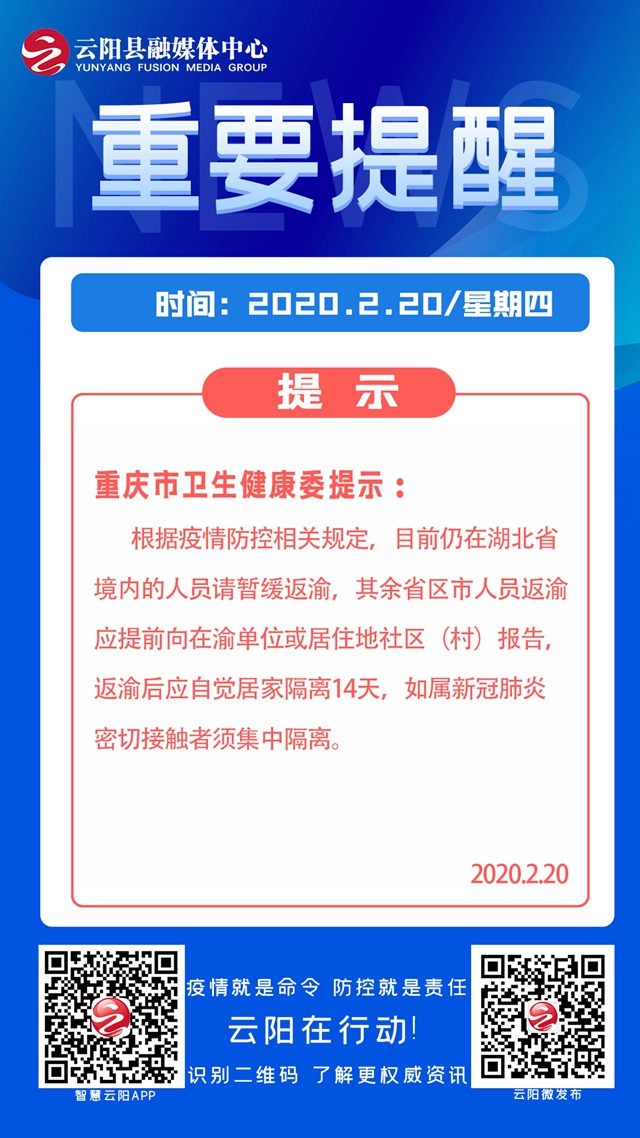重慶市衛(wèi)生健康委提示:根據(jù)疫情防控相關(guān)規(guī)定,目前仍在湖北省境內(nèi)的人員請(qǐng)暫緩返渝,其余省區(qū)市人員返渝應(yīng)提前向在渝單位或居住地社區(qū)(村)報(bào)告,返渝后應(yīng)自覺居家隔離14天,如屬新冠肺炎密切接觸者須集中隔離。