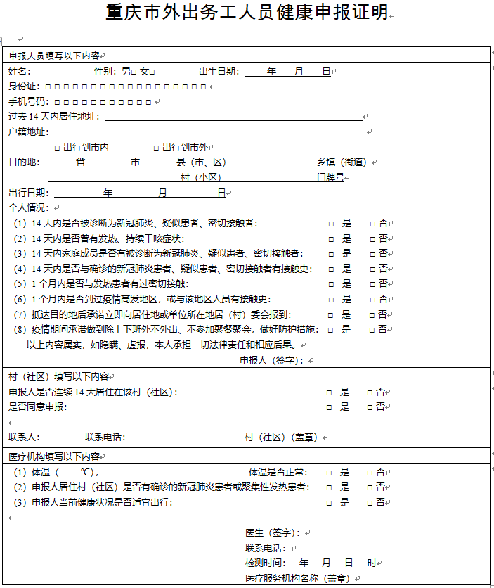 (二)服務內容。居住地醫療衛生機構對有外出務工需要的申報人在開展流行病學史調查和測量體溫的基礎上,為符合條件的申報人員免費出具市衛生健康委印制的《重慶市外出務工人員健康申報證明》(詳見附件,以下簡稱證明)。