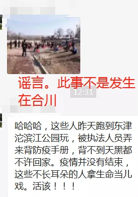 今日,合川區有微信群傳播一則消息:昨日,市民跑到東津沱濱江公園玩,被執法人員弄來背防疫手冊,背不到天黑都不許回家。