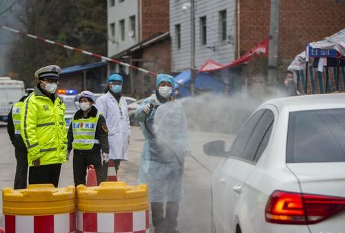 ▲2月14日,萬(wàn)州區(qū)龍駒鎮(zhèn),交警等部門(mén)組成的聯(lián)防聯(lián)控隊(duì)伍正在對(duì)來(lái)往車(chē)輛進(jìn)行消毒。記者 龍帆 攝