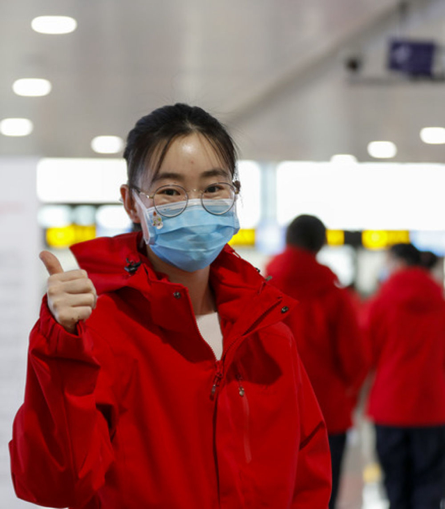 ↑2月20日,在重慶江北國(guó)際機(jī)場(chǎng),重慶市第十三批支援湖北醫(yī)療隊(duì)隊(duì)員在出發(fā)前為自己加油。新華社發(fā)(黃偉 攝)