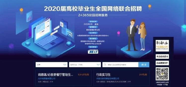 2月28日,教育部啟動(dòng)“2020屆高校畢業(yè)生全國(guó)網(wǎng)絡(luò)聯(lián)合招聘——24365校園招聘服務(wù)”活動(dòng),為高校畢業(yè)生提供每天24小時(shí)全年365天的網(wǎng)上校園招聘服務(wù),畢業(yè)生可登陸活動(dòng)平臺(tái)(www.ncss.cn)及各有關(guān)網(wǎng)站專(zhuān)欄參加求職招聘。
