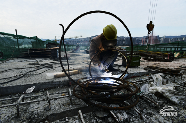 云陽縣長江大橋南橋頭互通提速擴建工程工地上,一名電焊工在忙著拼接鋼模為混凝土澆筑者上工干活備好材料。