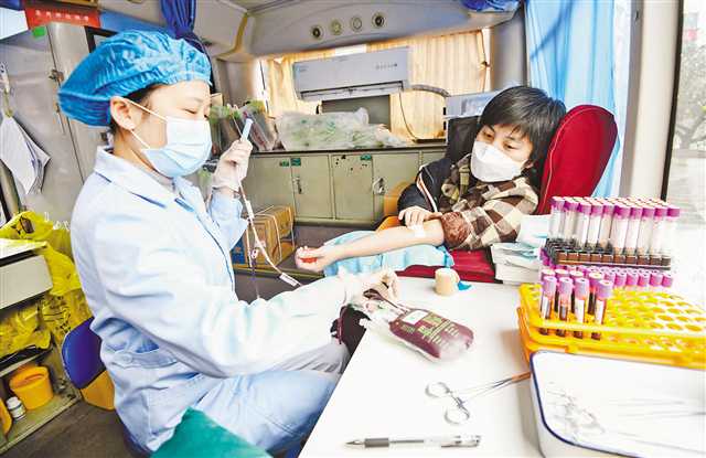 3月4日,九龍坡區(qū)楊家坪步行街,志愿者正在采血車(chē)上獻(xiàn)血。記者 鄭宇 攝