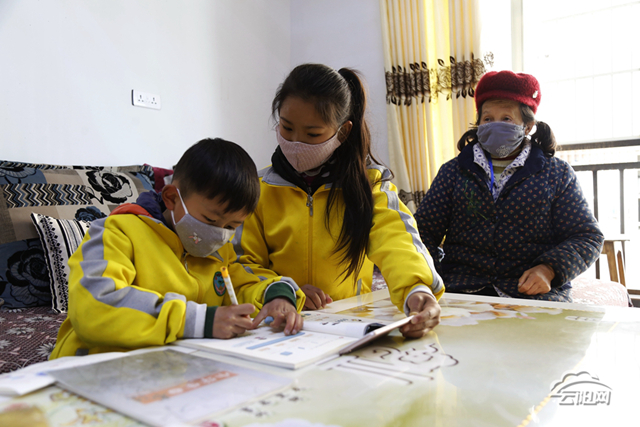 3月6日早上8點半,云陽鎮東風小學二年級教師李小平準時到達學生周彩霞家中,她打開語文課本,讓周彩霞和她弟弟周文濤一起跟著她讀拼音,姐弟倆認真地跟著李老師讀了一遍又一遍。