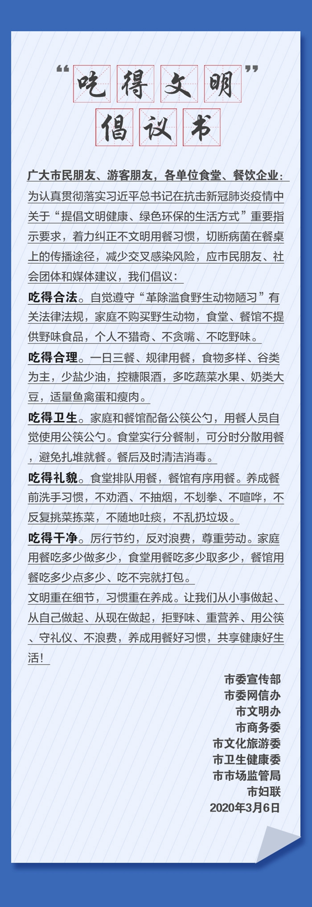 應市民朋友、社會團體和媒體建議,3月6日,重慶市委宣傳部、市委網信辦、市文明辦、市商務委、市文旅委、市衛健委、市市場監管局、市婦聯等多個部門聯合發出“吃得文明”倡議,希望廣大市民、社會單位、餐館食堂,從小事做起,從現在做起,從自身做起,拒野味、重營養、用公筷、守禮儀、不浪費,養成用餐好習慣,共享健康好生活。