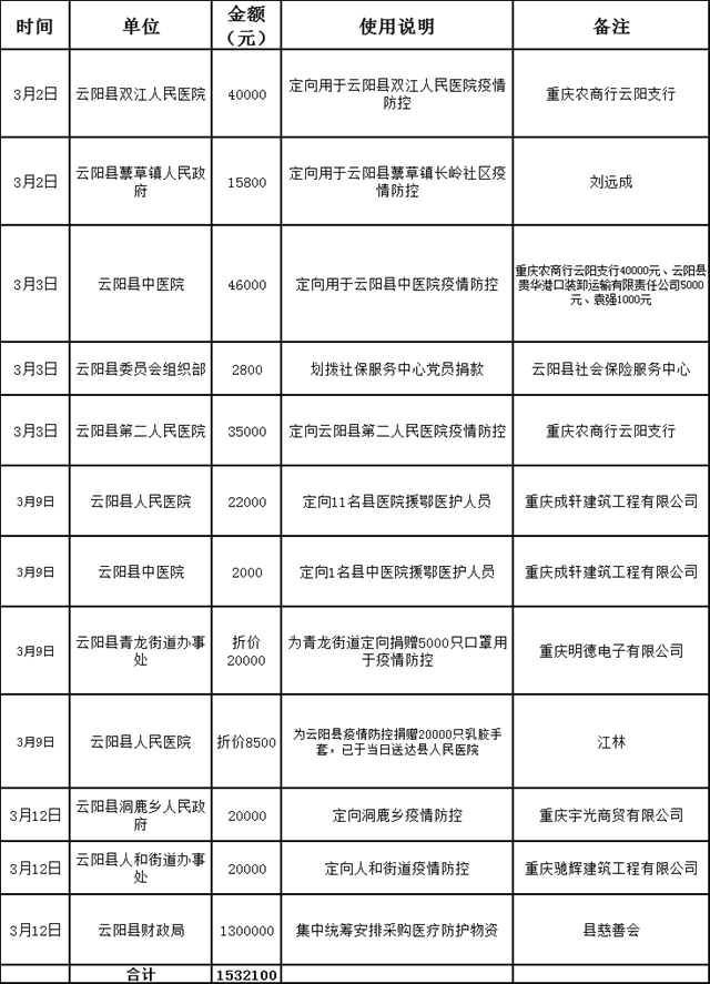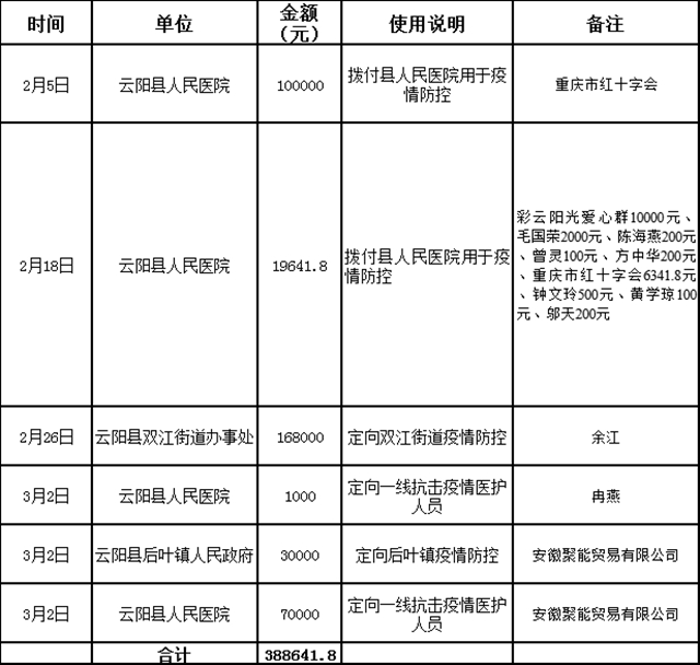 自2月19日15點至3月12日15點,云陽縣慈善會共匯總接受各方面援助我縣抗擊新冠肺炎疫情的資金2381234.66元,物資折幣4581908.00元(不包括尚未折價的物資)。