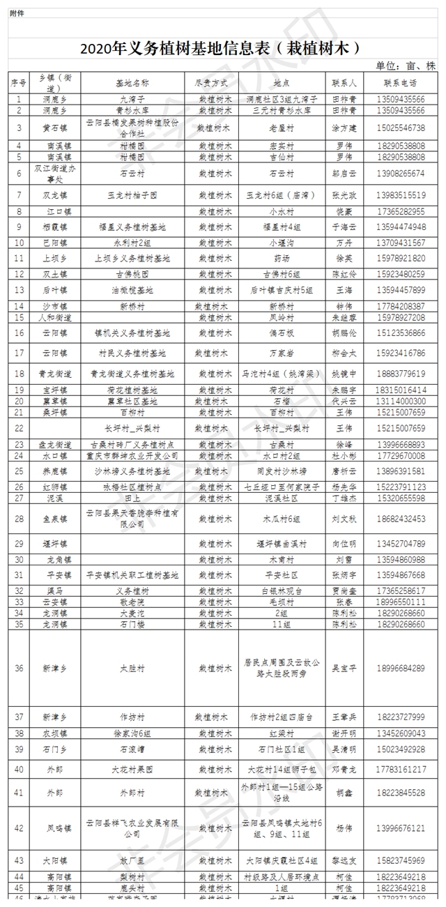 2020年義務植樹基地信息表(栽植樹木&認管認養)發布