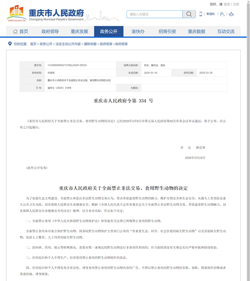 重慶市人民政府關于全面禁止非法交易、食用野生動物的決定。(網頁截圖)