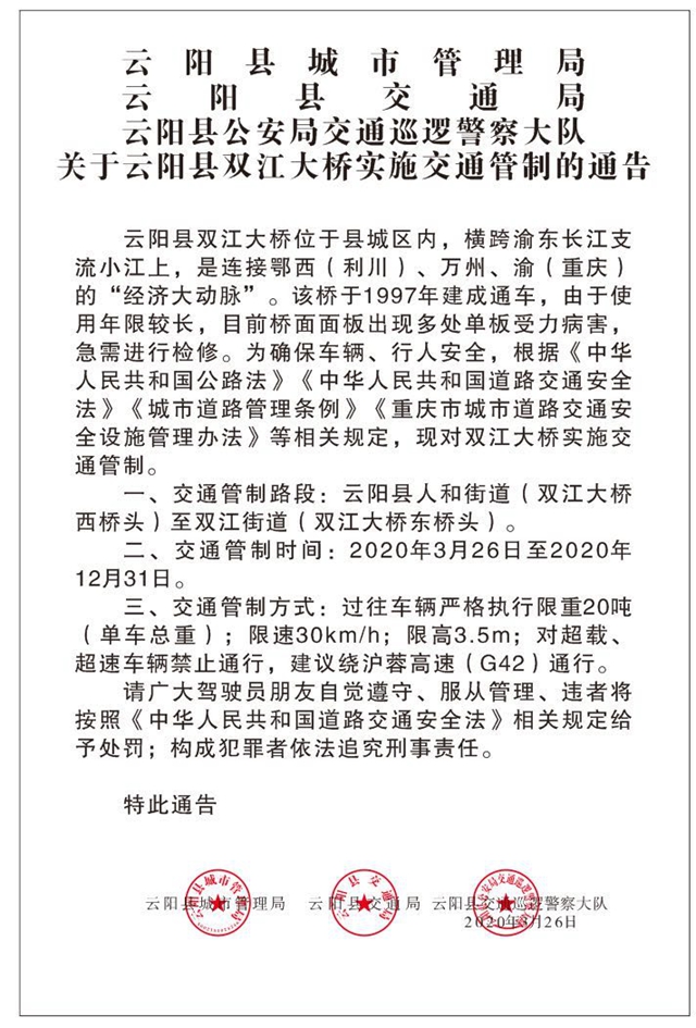 轉發擴散!云陽雙江大橋實行交通管制,具體時間是...