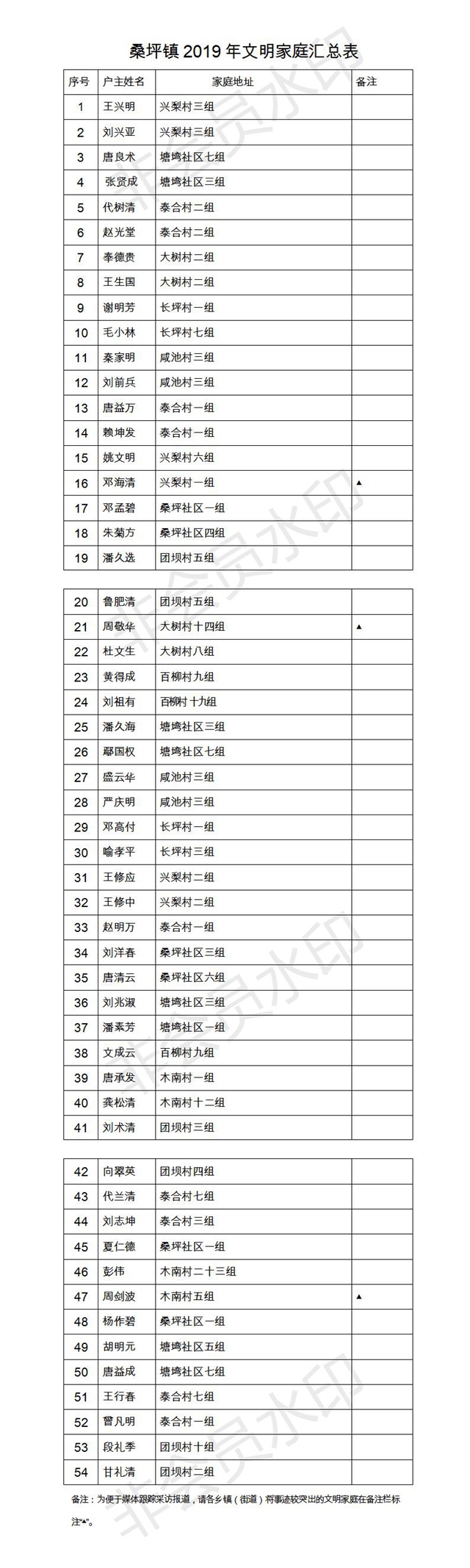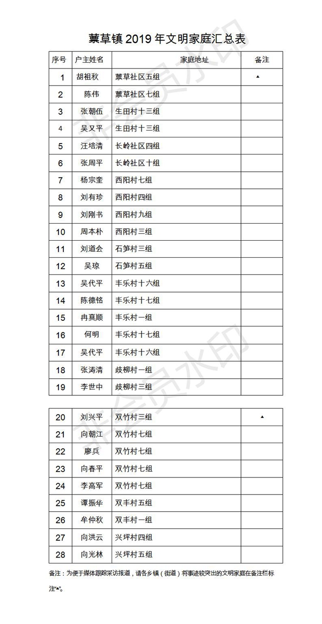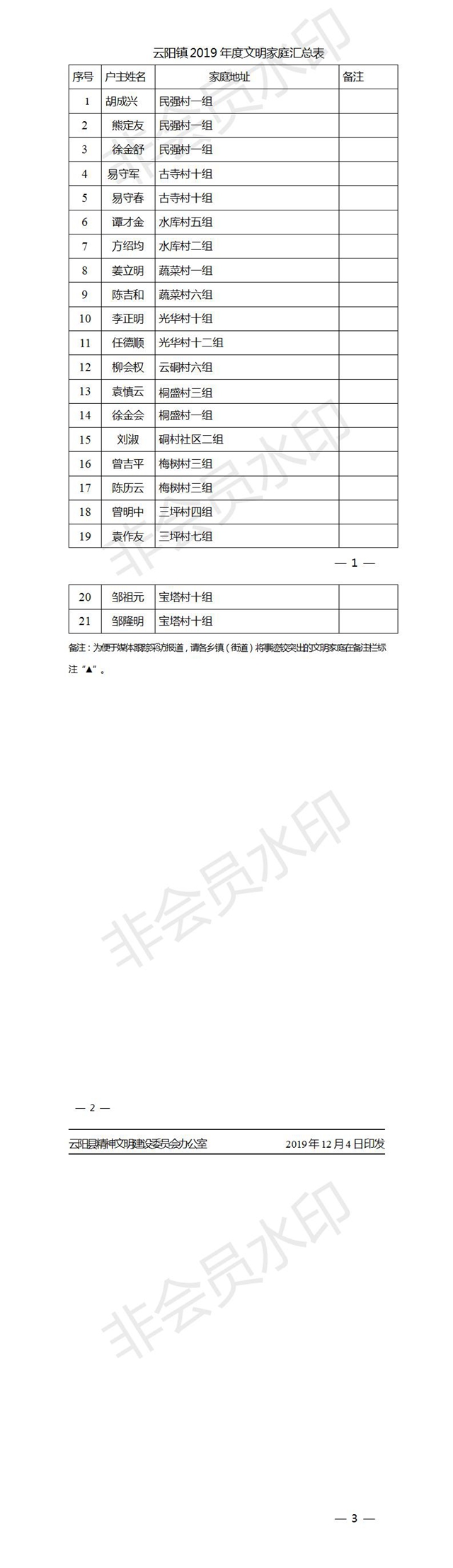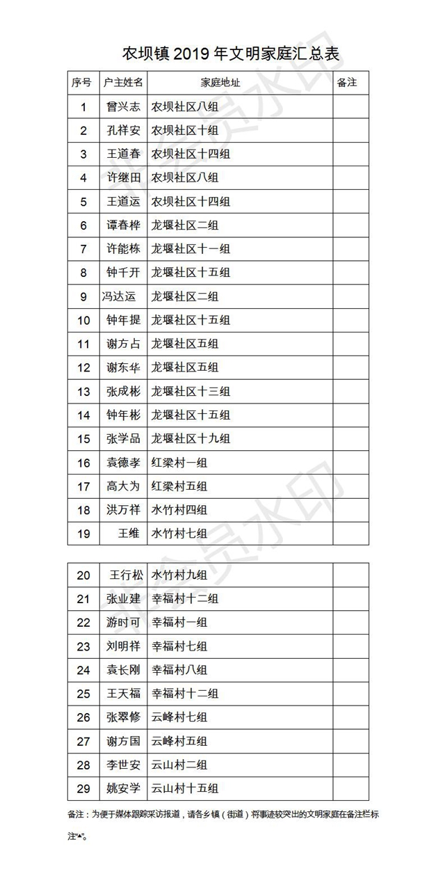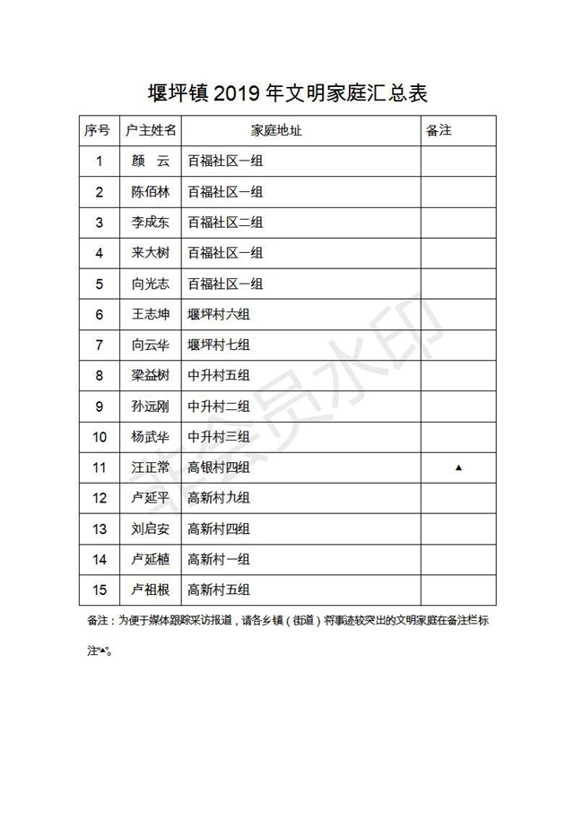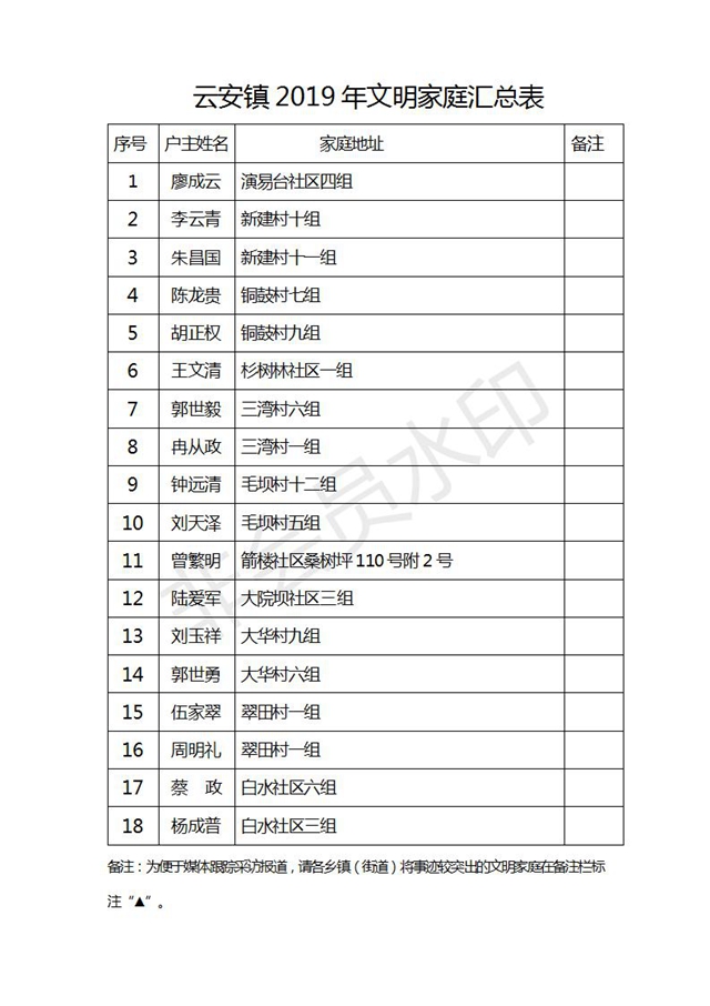根據(jù)《云陽縣精神文明建設(shè)委員會關(guān)于深化文明家庭創(chuàng)建評選活動的通知》(云文明委〔2017〕4號)和《關(guān)于對文明家庭創(chuàng)建評選活動有關(guān)事項作出調(diào)整的通知》(云文明辦白頭)文件要求,縣文明辦認(rèn)真組織開展2019年度縣級文明家庭創(chuàng)建評選工作,經(jīng)村(社區(qū))自評、鄉(xiāng)鎮(zhèn)(街道)初評、縣文明辦終評等程序,已評選出2019年度縣級文明家庭。現(xiàn)將2019年度縣級文明家庭名單公示如下。